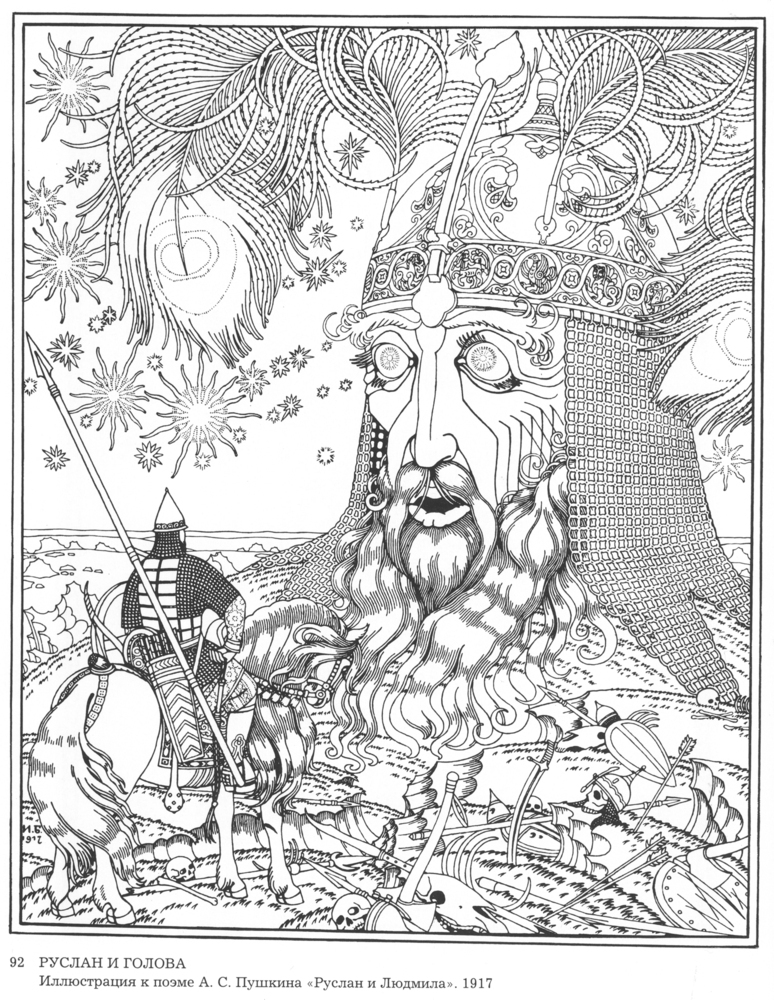 Nous vous proposons une reproduction artisanale sur toile du célèbre tableau 'Illustration du poème «Ruslan et Lyudmila» par Alexander Pouchki' de Ivan Bilibin, provenant du Musée de la Reproduction.