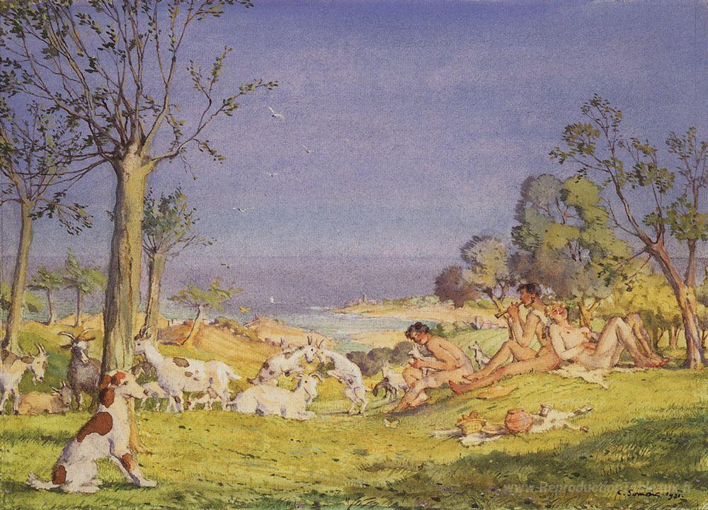 Découvrez l'univers enchanteur des peintures à l'huile à travers nos reproductions d'œuvres d'art soigneusement sélectionnées. Parmi celles-ci, Illustration du roman Daphnis et Chloé 1 de l'artiste renommé Konstantin Somov, qui avec finesse, capture la beauté et l'essence des émotions humaines. Somov, figure emblématique du mouvement artistique russe du début du XXe siècle, maîtrise un style alliant romantisme et symbolisme, invitant le spectateur à plonger dans un monde de rêverie.