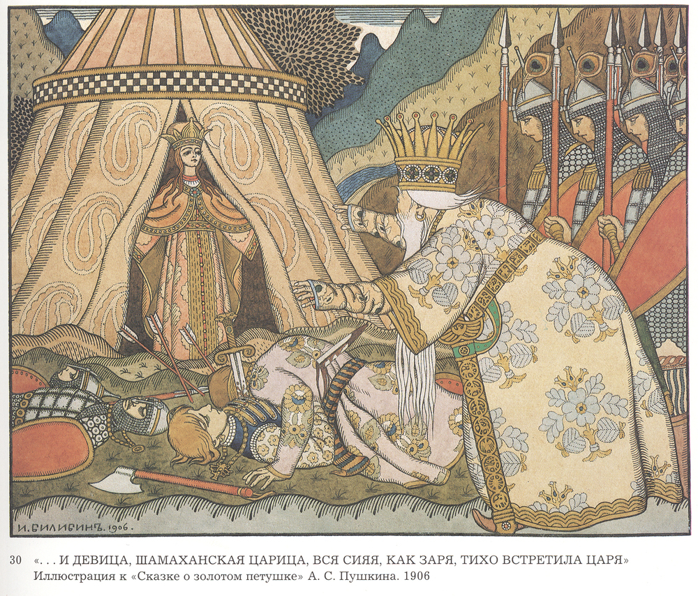 Nous vous proposons une reproduction artisanale sur toile du célèbre tableau 'Illustration pour le poème «The Tale of the Golden Cockerel» par' de Ivan Bilibin, provenant du Musée de la Reproduction.
