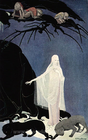 Nous vous proposons une reproduction artisanale sur toile du célèbre tableau 'Illustration pour les trois mulla-mugars' de Dorothy Lathrop, provenant du Musée de la Reproduction.