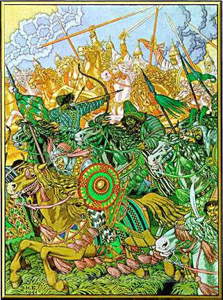 Nous vous proposons une reproduction artisanale sur toile du célèbre tableau 'Illustration pour l'histoire de la campagne d'Igor' de Ivan Bilibin, provenant du Musée de la Reproduction.