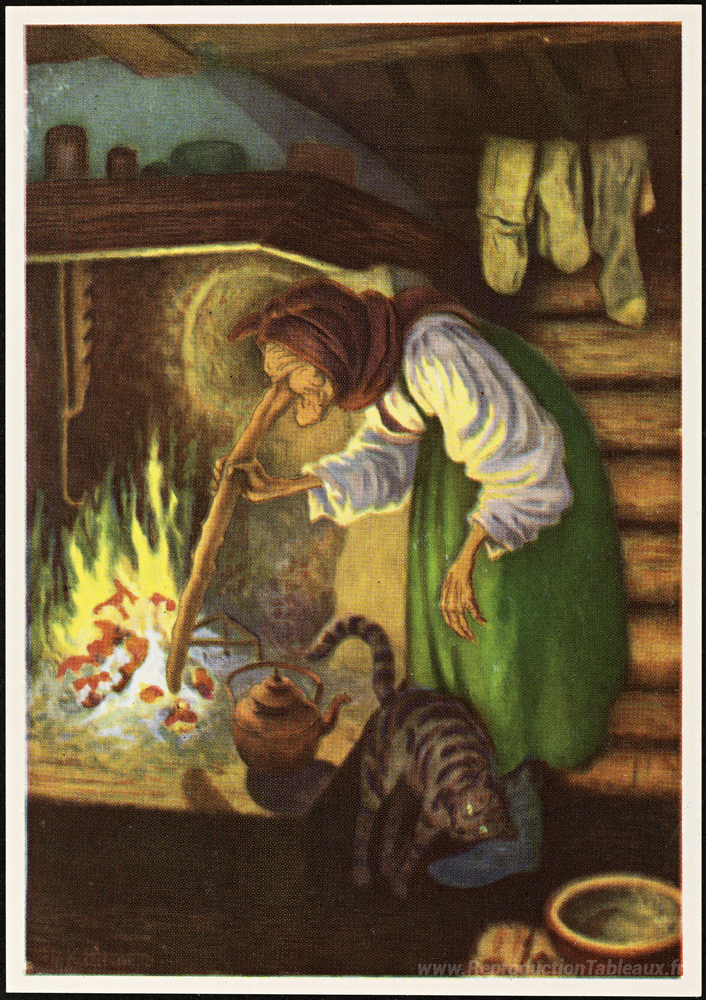 Nous vous proposons une reproduction artisanale sur toile du célèbre tableau '?Kjerringa ved peisen' de Theodor Severin Kittelsen, provenant du Musée de la Reproduction.