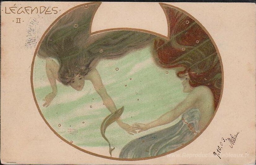 Nous vous proposons une reproduction artisanale sur toile du célèbre tableau 'Légendes' de Raphael Kirchner, provenant du Musée de la Reproduction.