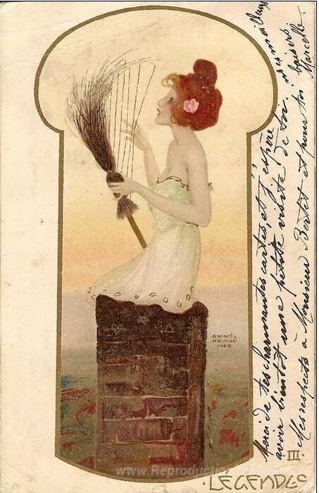 Nous vous proposons une reproduction artisanale sur toile du célèbre tableau 'Légendes' de Raphael Kirchner, provenant du Musée de la Reproduction.