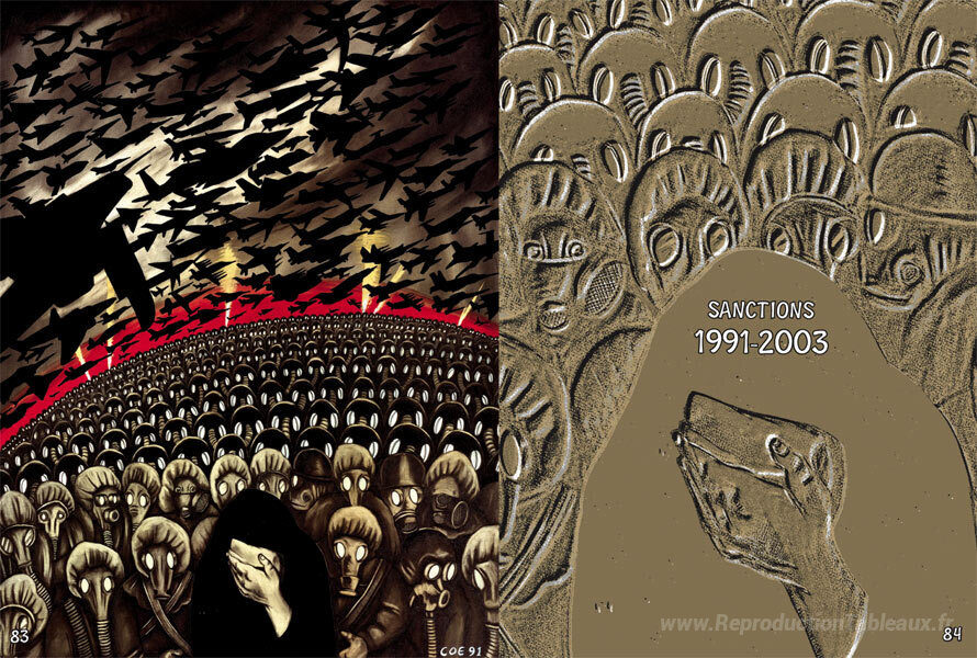 Nous vous proposons une reproduction artisanale sur toile du célèbre tableau 'La guerre du Golfe' de Sue Coe, provenant du Musée de la Reproduction.