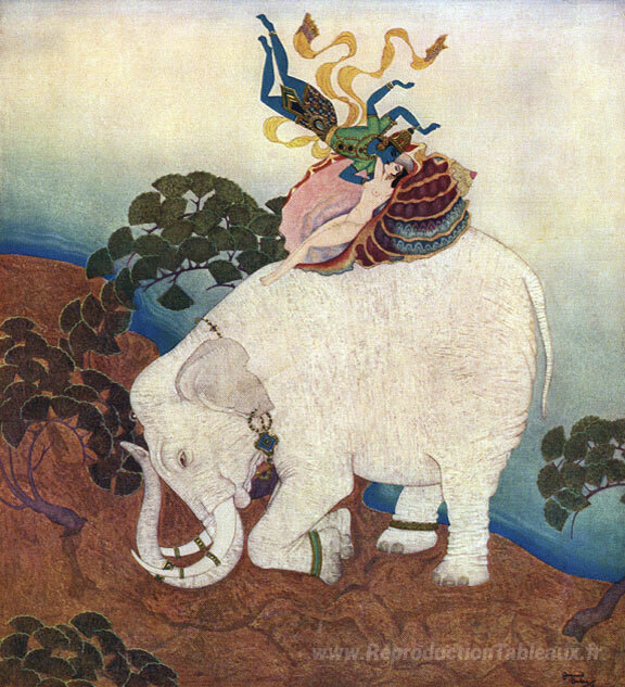 Nous vous proposons une reproduction artisanale sur toile du célèbre tableau 'La perle de l'éléphant, du royaume de la perle' de Edmund Dulac, provenant du Musée de la Reproduction.