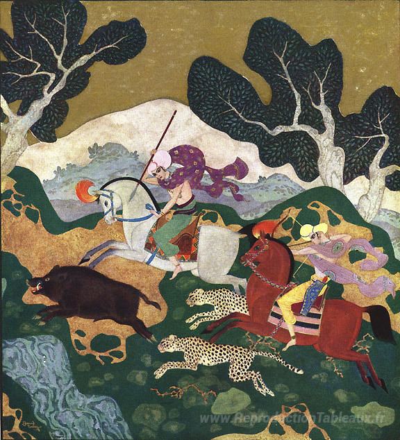 Nous vous proposons une reproduction artisanale sur toile du célèbre tableau 'La perle du sanglier, du royaume de la perle' de Edmund Dulac, provenant du Musée de la Reproduction.