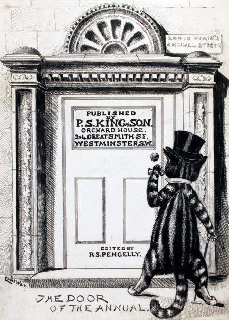 Nous vous proposons une reproduction artisanale sur toile du célèbre tableau 'La porte de la' de Louis Wain, provenant du Musée de la Reproduction.