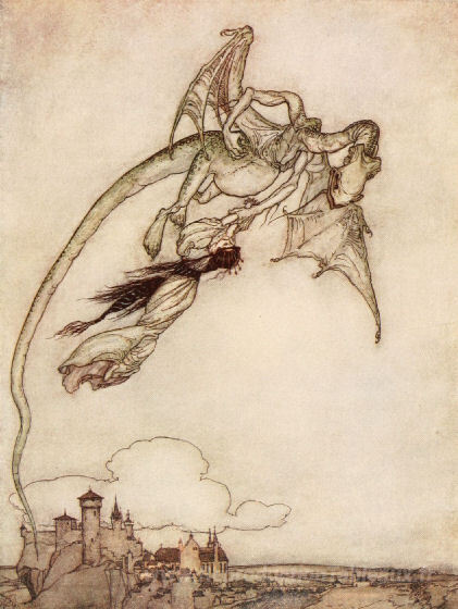 Nous vous proposons une reproduction artisanale sur toile du célèbre tableau 'La seule fille du roi avait été emportée par un dragon' de Arthur Rackham, provenant du Musée de la Reproduction.