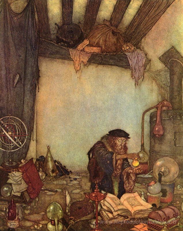 Nous vous proposons une reproduction artisanale sur toile du célèbre tableau 'L'alchimiste' de Edmund Dulac, provenant du Musée de la Reproduction.