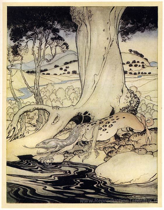 Nous vous proposons une reproduction artisanale sur toile du célèbre tableau 'Le dragon dans les bois près de Dublin' de Arthur Rackham, provenant du Musée de la Reproduction.