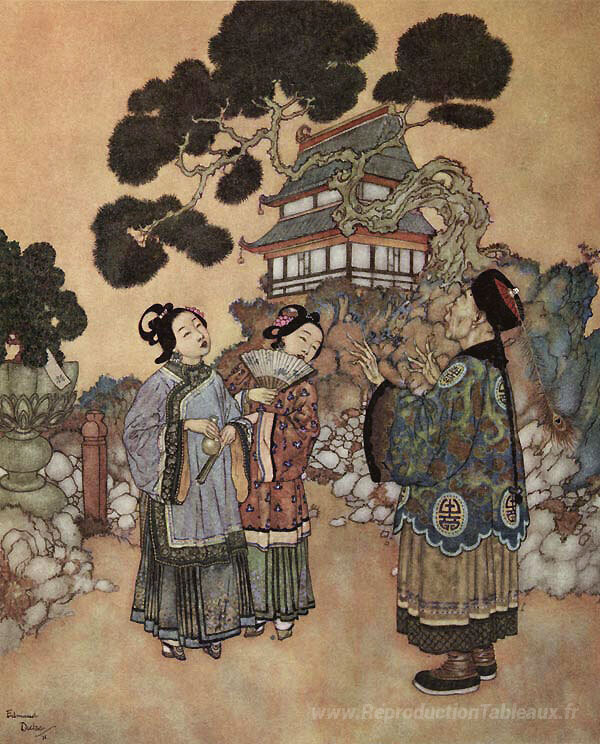 Nous vous proposons une reproduction artisanale sur toile du célèbre tableau 'Le même gargouillement - le rossignol' de Edmund Dulac, provenant du Musée de la Reproduction.