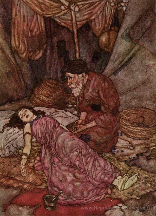 Nous vous proposons une reproduction artisanale sur toile du célèbre tableau 'Le visage de l'homme misérable, le rubaiyat d'Omar Khayyam' de Edmund Dulac, provenant du Musée de la Reproduction.