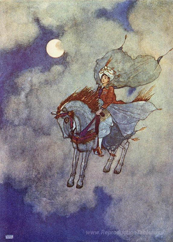 Nous vous proposons une reproduction artisanale sur toile du célèbre tableau 'Les nuits arabes: la lumière du jour s'estompa de la vue' de Edmund Dulac, provenant du Musée de la Reproduction.