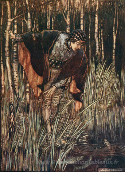 Nous vous proposons une reproduction artisanale sur toile du célèbre tableau 'Les poissons, dans leur joie, s'étendaient sur la tête au-dessus' de Arthur Rackham, provenant du Musée de la Reproduction.