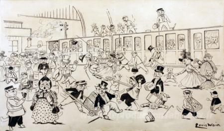 Nous vous proposons une reproduction artisanale sur toile du célèbre tableau 'L'excursion du chat' de Louis Wain, provenant du Musée de la Reproduction.