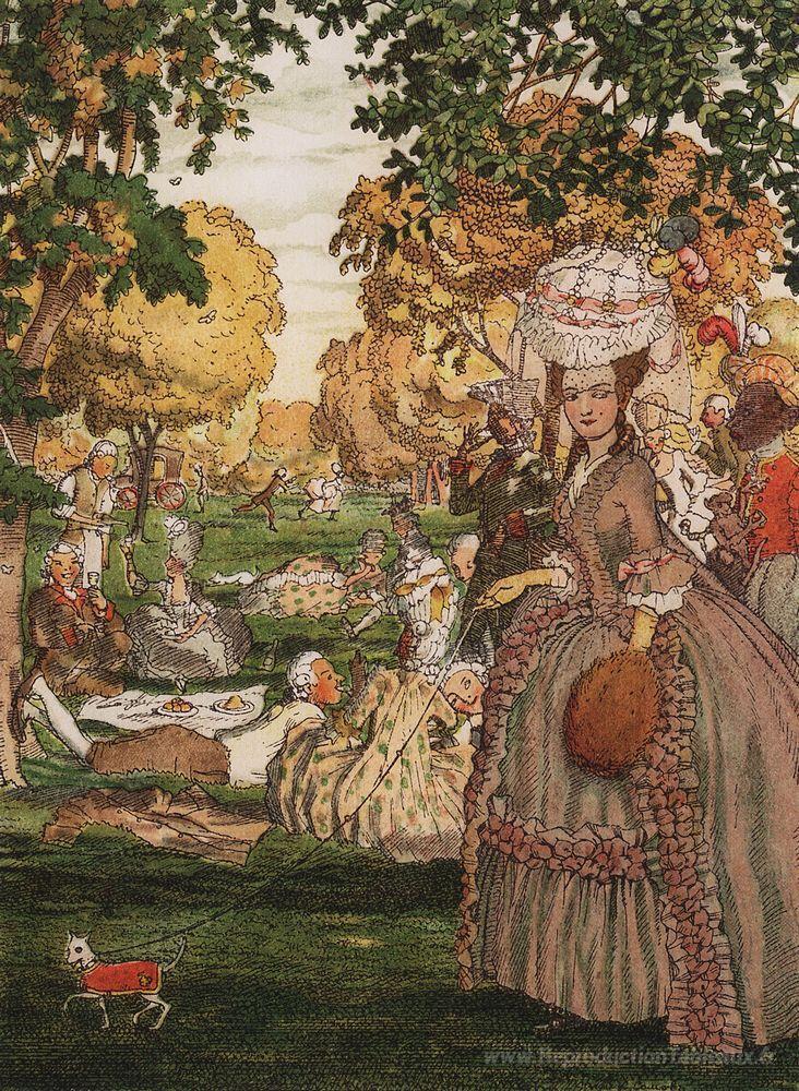 Nous vous proposons une reproduction artisanale sur toile du célèbre tableau 'Livre de la marquise. Illustration 6' de Konstantin Somov, provenant du Musée de la Reproduction.