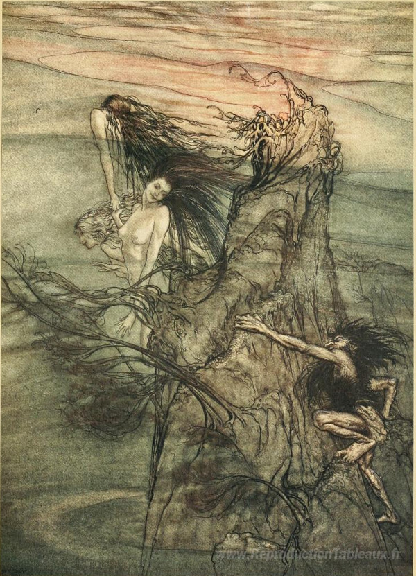 Nous vous proposons une reproduction artisanale sur toile du célèbre tableau 'Mock Loin! Faux! Les niblungs font pour votre jouet!' de Arthur Rackham, provenant du Musée de la Reproduction.
