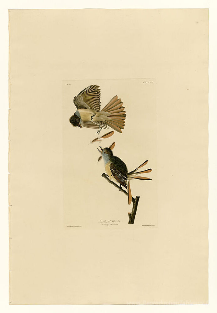 Nous vous proposons une reproduction artisanale sur toile du célèbre tableau 'Planche 129 Grand mouche à crête' de John James Audubon, provenant du Musée de la Reproduction.