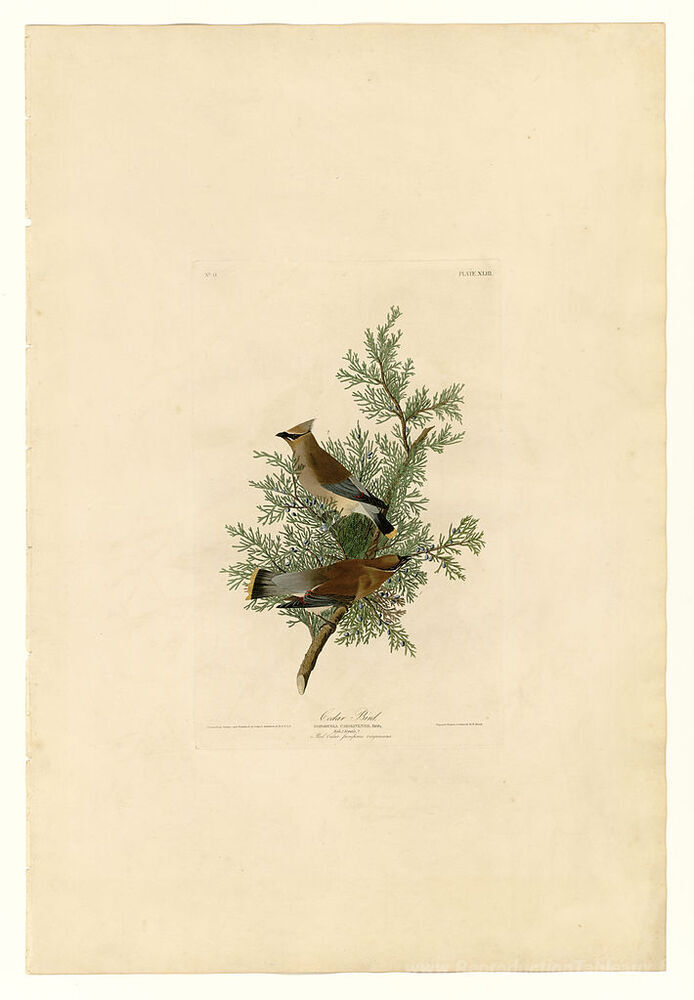 Nous vous proposons une reproduction artisanale sur toile du célèbre tableau 'Planche 43. Bird de cèdre' de John James Audubon, provenant du Musée de la Reproduction.