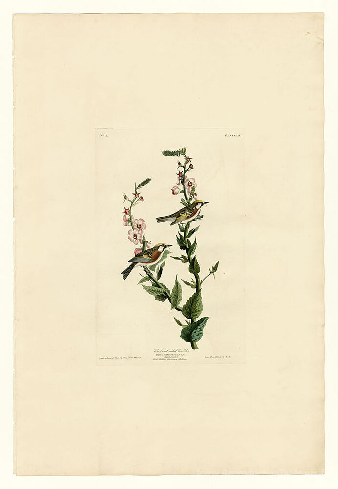Nous vous proposons une reproduction artisanale sur toile du célèbre tableau 'Planche 59. Paruline à côté de châtaignier' de John James Audubon, provenant du Musée de la Reproduction.