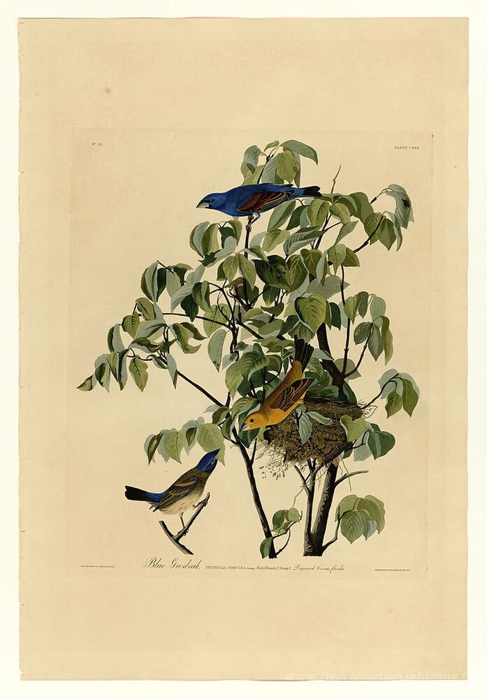 Nous vous proposons une reproduction artisanale sur toile du célèbre tableau 'Plaque 122 Grosbeak bleu' de John James Audubon, provenant du Musée de la Reproduction.