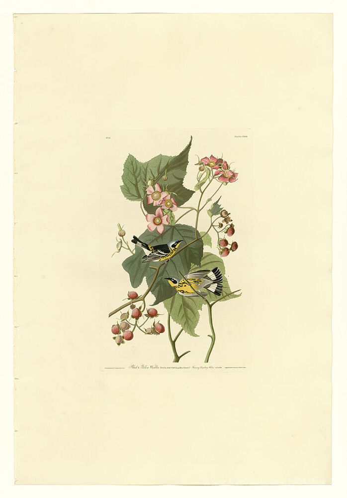 Nous vous proposons une reproduction artisanale sur toile du célèbre tableau 'Plaque 123 Warblers noirs et jaunes' de John James Audubon, provenant du Musée de la Reproduction.