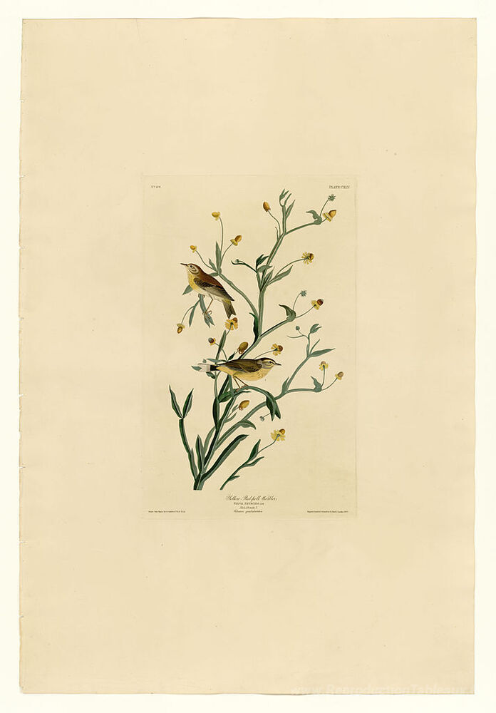 Nous vous proposons une reproduction artisanale sur toile du célèbre tableau 'Plaque 145 Paruline jaune à pollet rouge' de John James Audubon, provenant du Musée de la Reproduction.