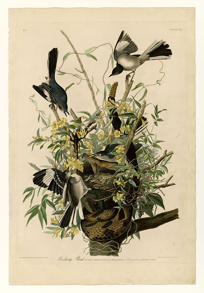 Nous vous proposons une reproduction artisanale sur toile du célèbre tableau 'Plaque 21. oiseau moqueur' de John James Audubon, provenant du Musée de la Reproduction.
