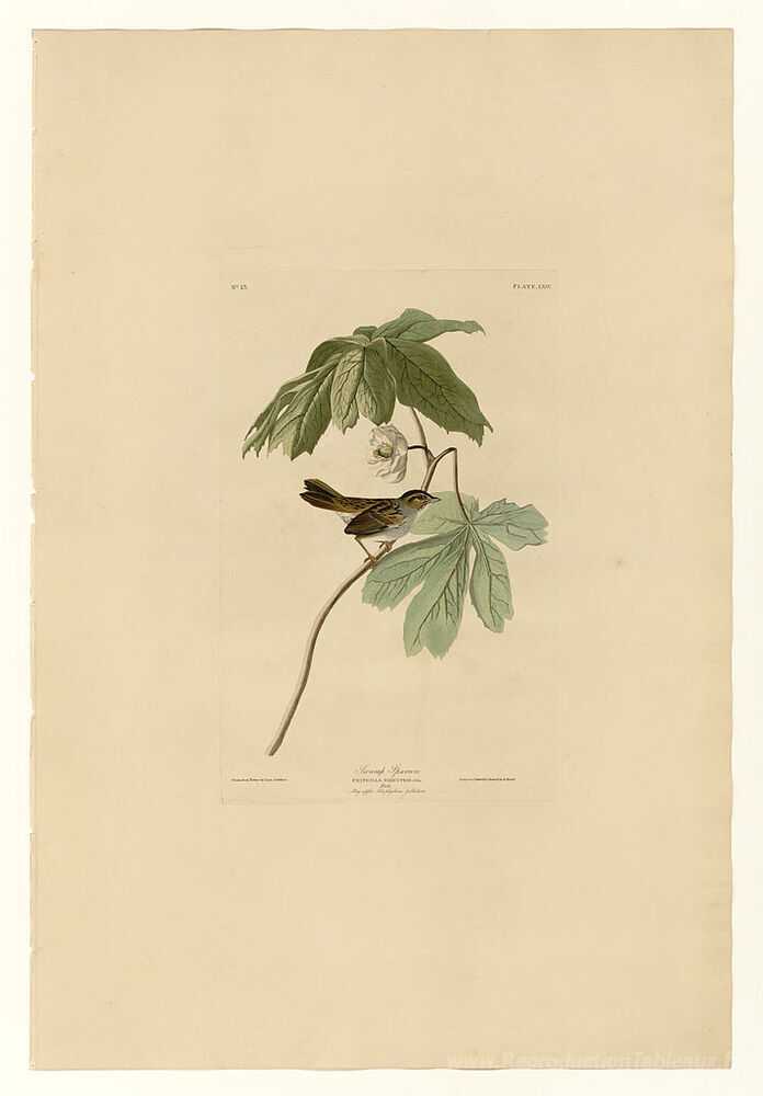 Nous vous proposons une reproduction artisanale sur toile du célèbre tableau 'Plaque 64 Swamp Sparrow' de John James Audubon, provenant du Musée de la Reproduction.