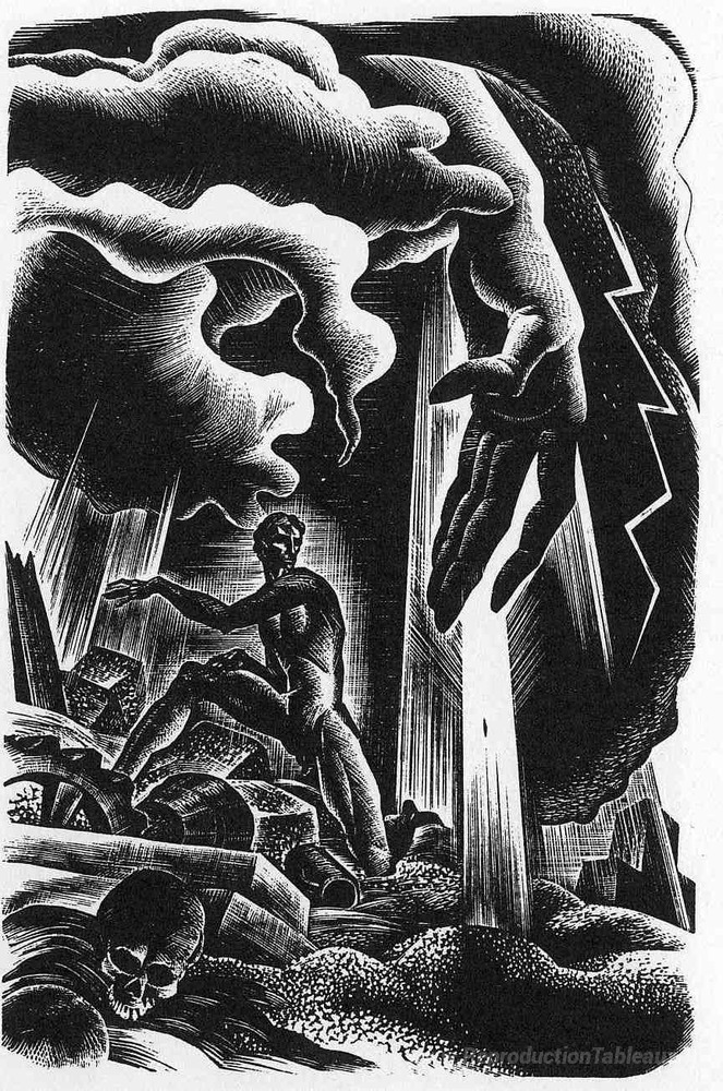 Nous vous proposons une reproduction artisanale sur toile du célèbre tableau 'Prélude à un million d'années' de Lynd Ward, provenant du Musée de la Reproduction.