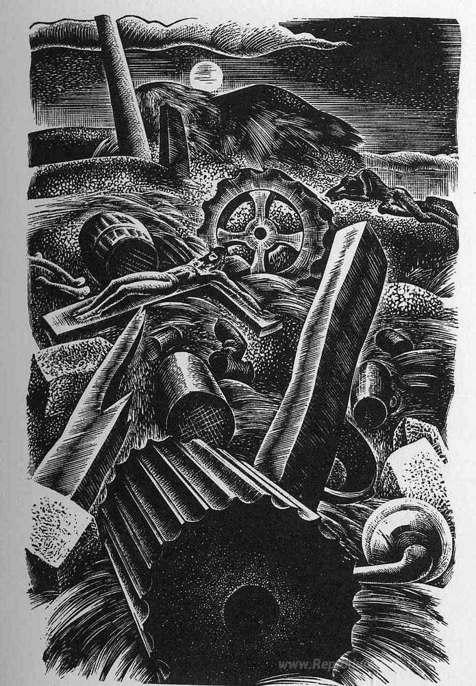 Nous vous proposons une reproduction artisanale sur toile du célèbre tableau 'Prélude à un million d'années' de Lynd Ward, provenant du Musée de la Reproduction.