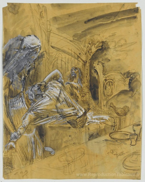 Nous vous proposons une reproduction artisanale sur toile du célèbre tableau 'Projet d'illustrazione versare Macbeth- apparizione du spettro à' de Luc-Olivier Merson, provenant du Musée de la Reproduction.