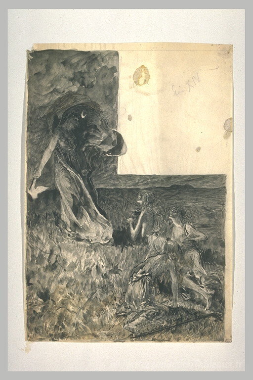 Nous vous proposons une reproduction artisanale sur toile du célèbre tableau 'Projet d'illustrazione versare Macbeth - Hécate et les trois sor' de Luc-Olivier Merson, provenant du Musée de la Reproduction.