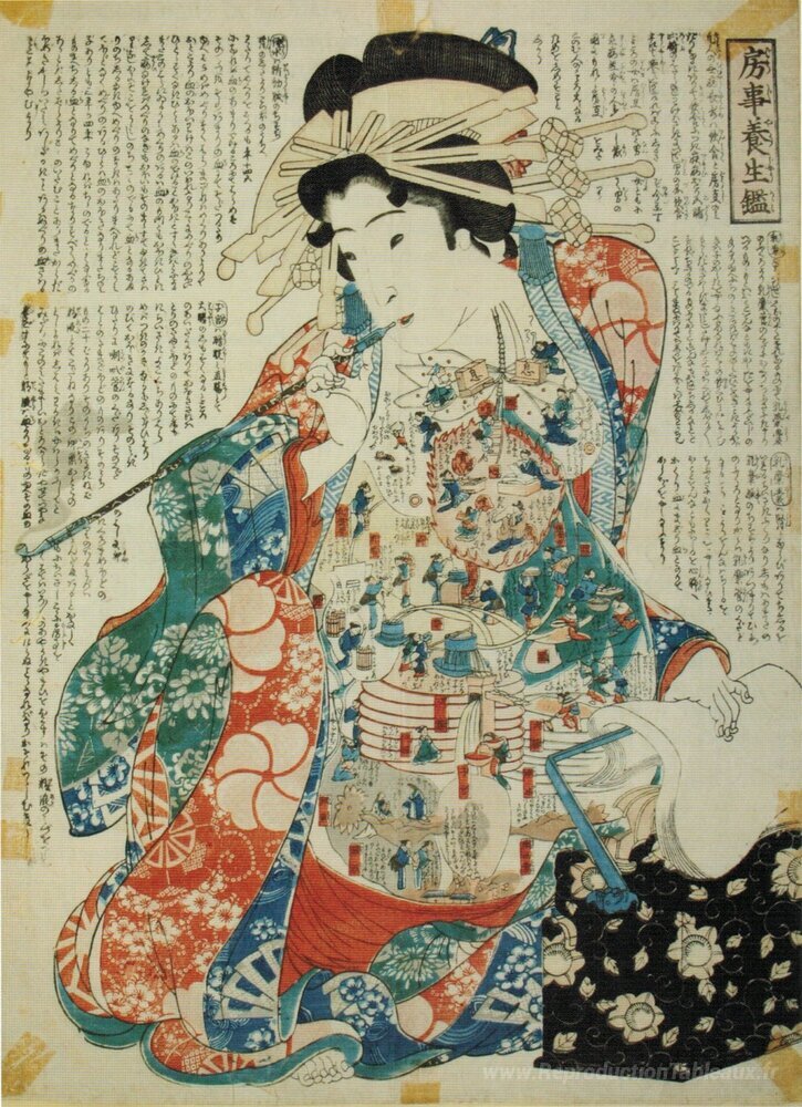 Nous vous proposons une reproduction artisanale sur toile du célèbre tableau 'Règles de la vie sexuelle' de Utagawa Kunisada, provenant du Musée de la Reproduction.