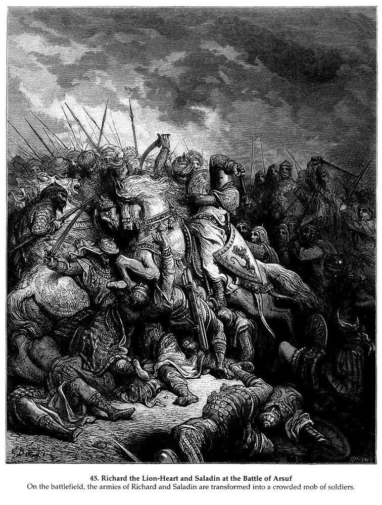 Bienvenue dans notre collection exclusive de peintures à l'huile, où chaque œuvre raconte une histoire unique et riche. Parmi nos pièces phares, découvrez Richard I le Lionheart au combat à Arsuf en 1191 de l'illustre artiste Gustave Doré. Ce chef-d'œuvre emblématique, réalisé au XIXe siècle, capture avec une puissance visuelle impressionnante la bravoure et la détermination du roi Richard lors de cette bataille décisive.