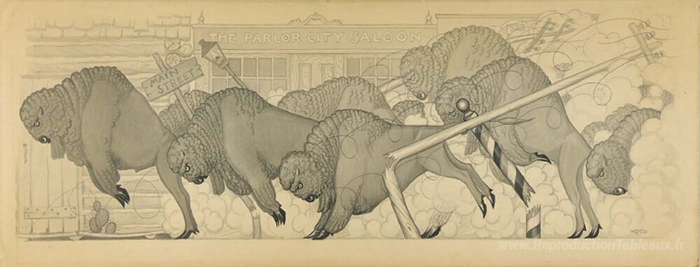 Nous vous proposons une reproduction artisanale sur toile du célèbre tableau 'Sans titre, de Suite Savage Iowa (Buffalo Stampede)' de Grant Wood, provenant du Musée de la Reproduction.