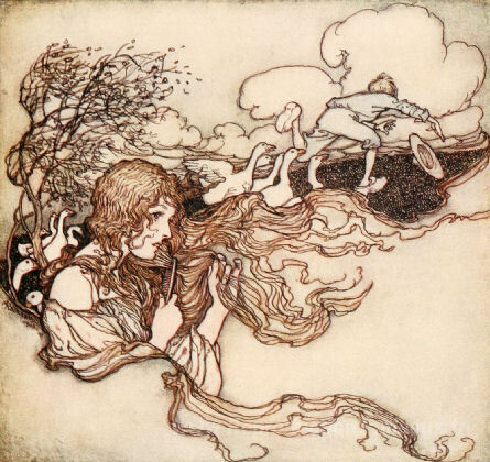 Nous vous proposons une reproduction artisanale sur toile du célèbre tableau 'Souffler, souffler, petite brise et le chapeau de Conrad' de Arthur Rackham, provenant du Musée de la Reproduction.