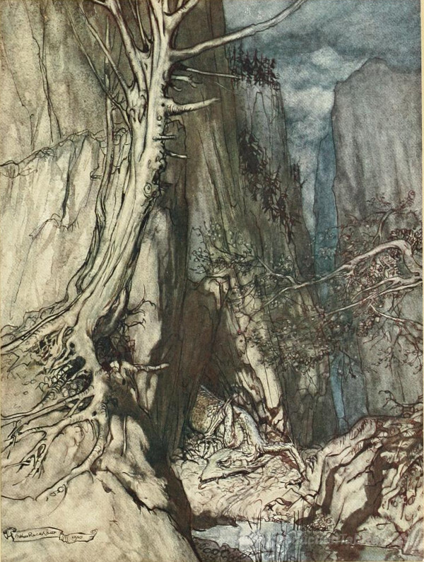 Nous vous proposons une reproduction artisanale sur toile du célèbre tableau 'Surveille sur la bague d'Alberich' de Arthur Rackham, provenant du Musée de la Reproduction.