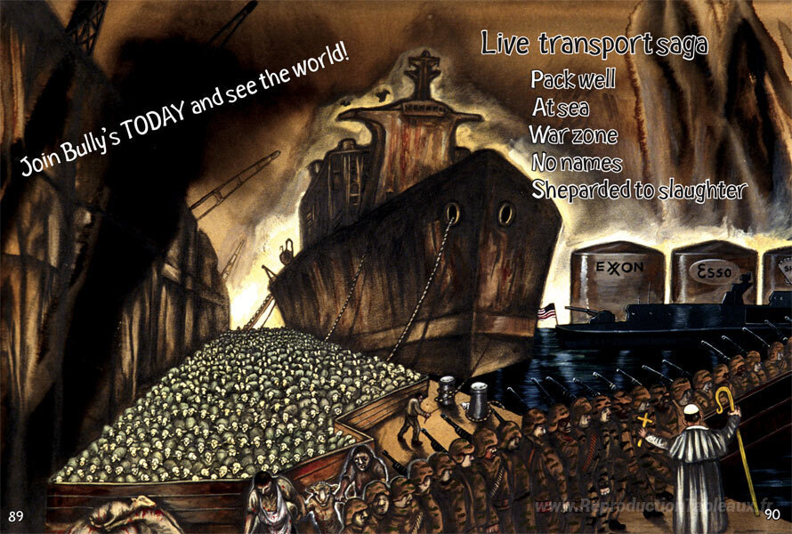 Nous vous proposons une reproduction artisanale sur toile du célèbre tableau 'Trasporto' de Sue Coe, provenant du Musée de la Reproduction.