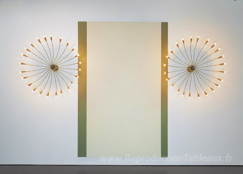 Nous vous proposons une reproduction artisanale sur toile du célèbre tableau 'AVEC LES DEUX LUSTRES (sculpture de meubles)' de John Armleder, provenant du Musée de la Reproduction.