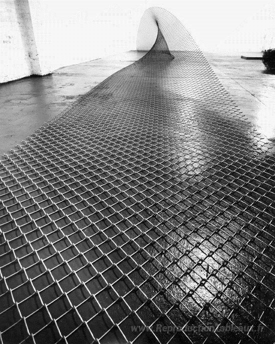Nous vous proposons une reproduction artisanale sur toile du célèbre tableau 'Clôture de cyclone' de Bill Bollinger, provenant du Musée de la Reproduction.