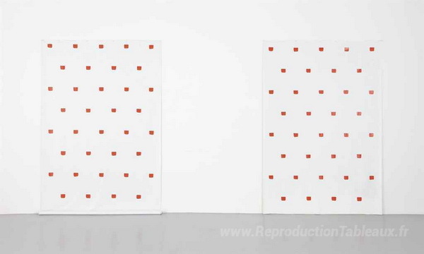 Nous vous proposons une reproduction artisanale sur toile du célèbre tableau 'Empreintes d'un pinceau n ° 50 répété à intervalles réguliers de' de Niele Toroni, provenant du Musée de la Reproduction.