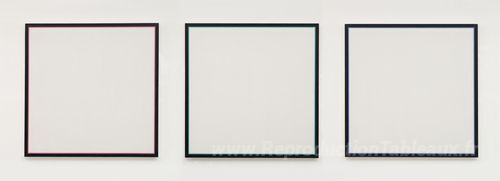 Nous vous proposons une reproduction artisanale sur toile du célèbre tableau 'Groupe de lumière primaire: rouge, vert, bleu' de Jo Baer, provenant du Musée de la Reproduction.