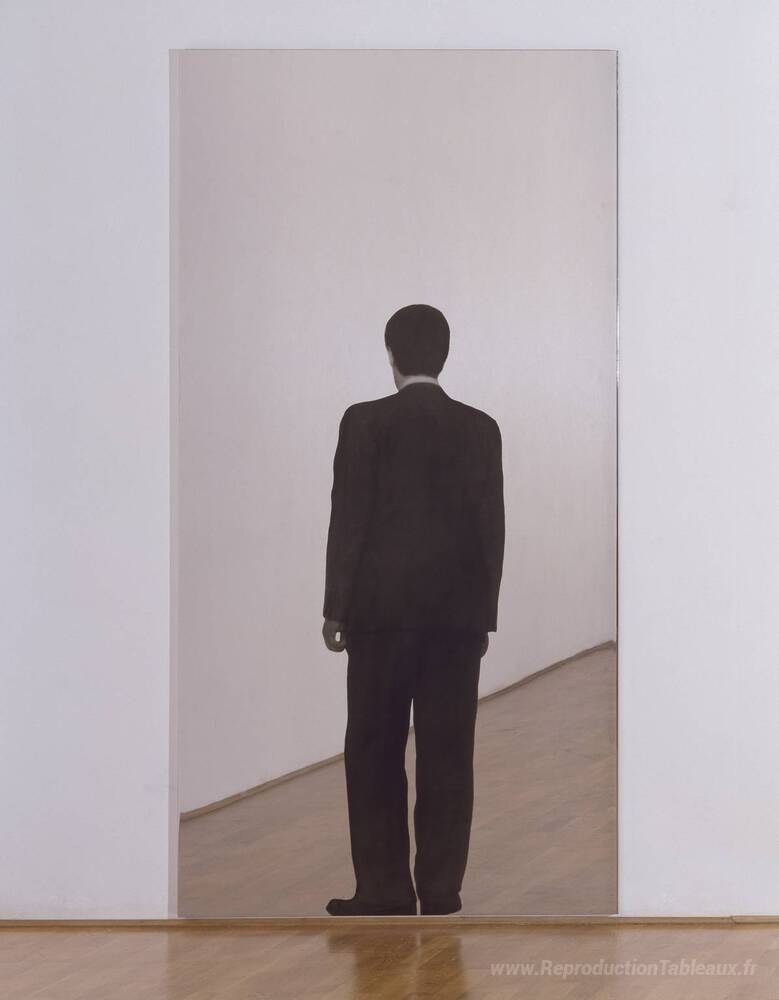 Nous vous proposons une reproduction artisanale sur toile du célèbre tableau 'Homme debout (peinture miroir)' de Michelangelo Pistoletto, provenant du Musée de la Reproduction.