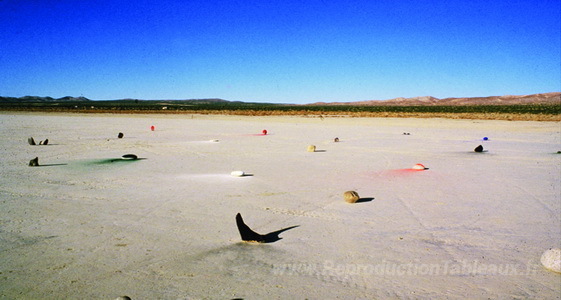 Nous vous proposons une reproduction artisanale sur toile du célèbre tableau 'Installation de roches et de pigments' de Lita Albuquerque, provenant du Musée de la Reproduction.