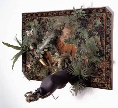 Nous vous proposons une reproduction artisanale sur toile du célèbre tableau 'La giungla' de Daniel Spoerri, provenant du Musée de la Reproduction.