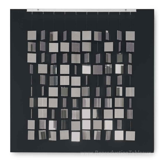 Nous vous proposons une reproduction artisanale sur toile du célèbre tableau 'Móvil cuadrado plateado sobre negro' de Julio Le Parc, provenant du Musée de la Reproduction.