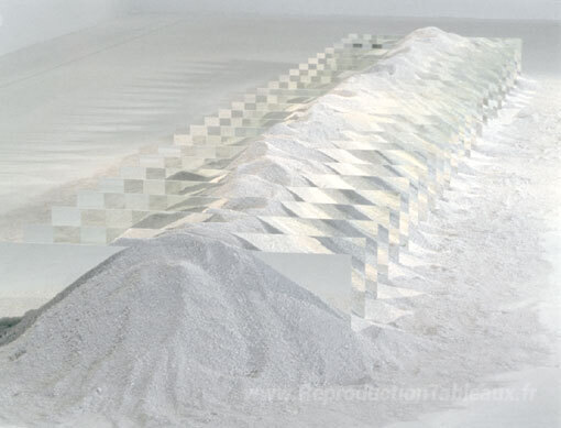 Nous vous proposons une reproduction artisanale sur toile du célèbre tableau 'Miroirs et sable Shelly' de Robert Smithson, provenant du Musée de la Reproduction.
