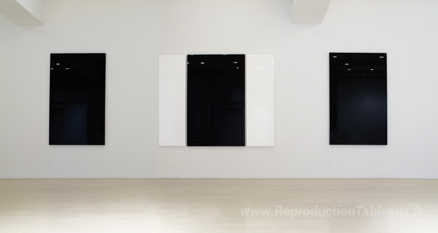 Nous vous proposons une reproduction artisanale sur toile du célèbre tableau 'Orange, peinture noire avec bord bleu et bordeaux' de Robert Irwin, provenant du Musée de la Reproduction.